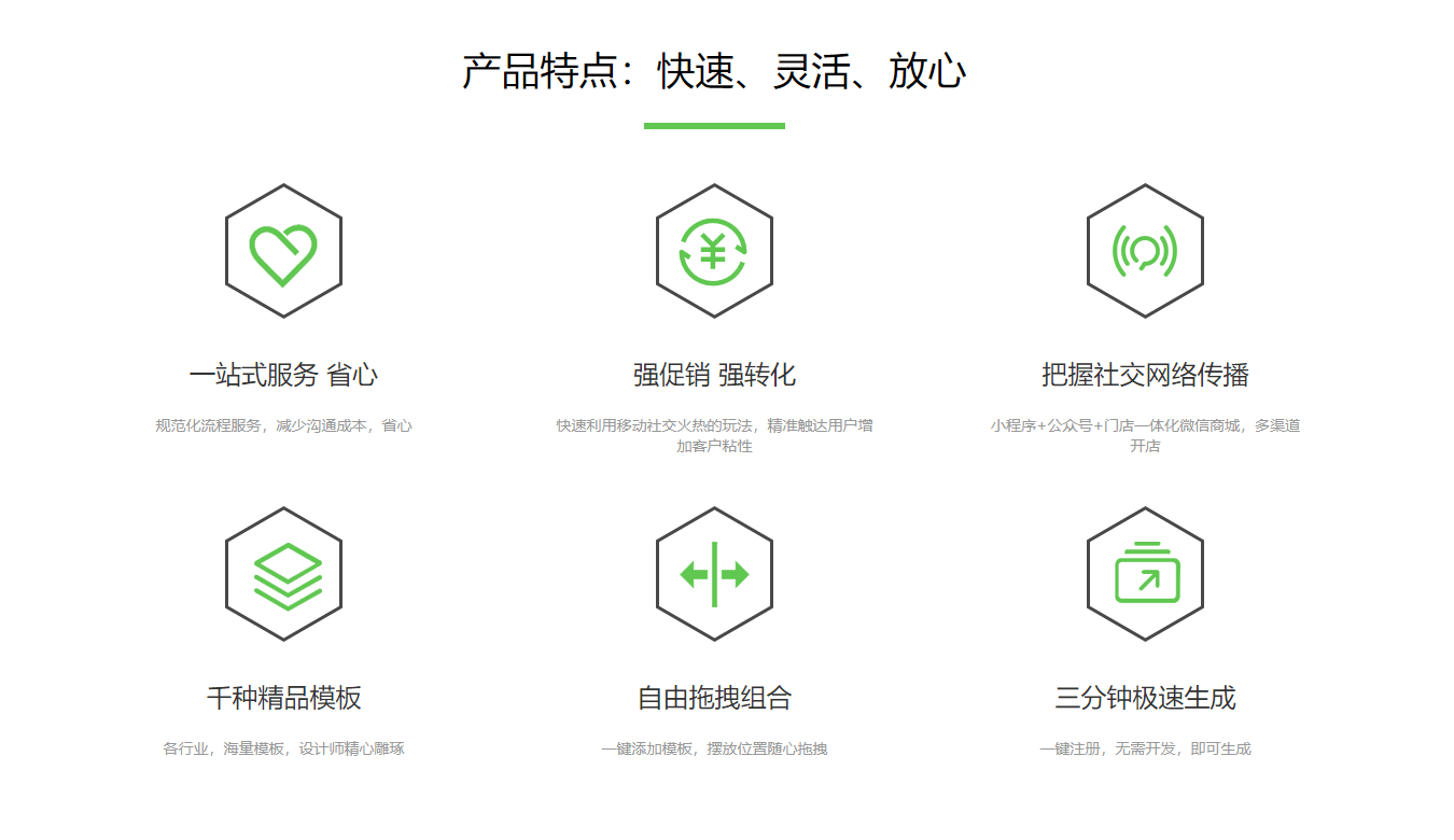 微服务平台为用户提供一站式微营销服务,包括公众号搭建、微商城、小程序服务。将各行各业实体门店场景与微信结合,实现品牌宣传、商品销售、门店服务、线上收款、活动促销、营销推广等智能功能。适用于零售、汽车、连锁、餐饮、酒店、医疗、教育培训等行业。